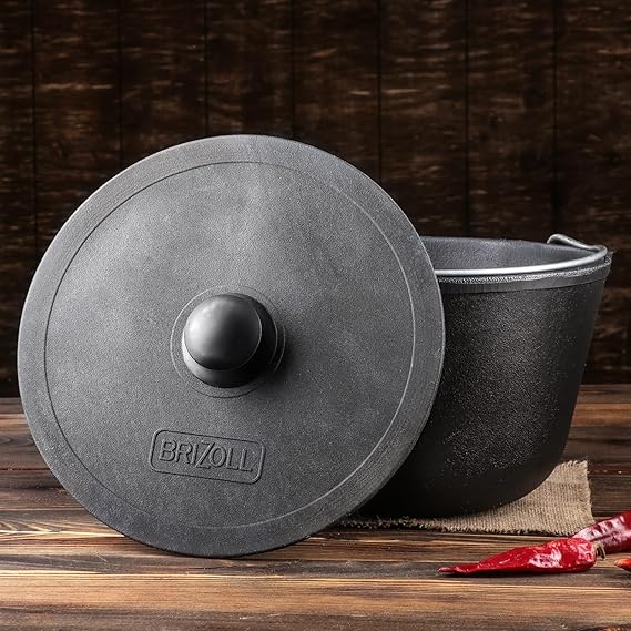 Esta cacerola de hierro fundido de 8 litros es una de esas piezas que nacen para vivir entre brasas y aromas antiguos. Su estructura maciza, su tapa pesada y su asa resistente la convierten en una compañera fiel para quienes aman el fuego lento, la cocina rústica y los sabores que necesitan tiempo para despertar.