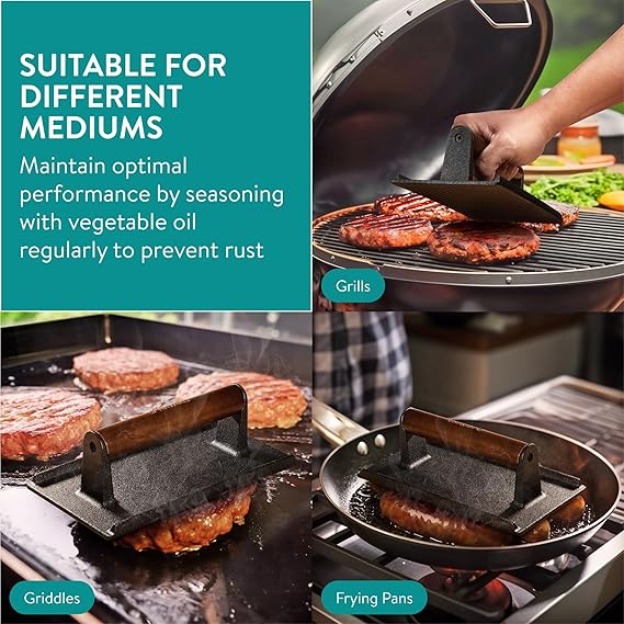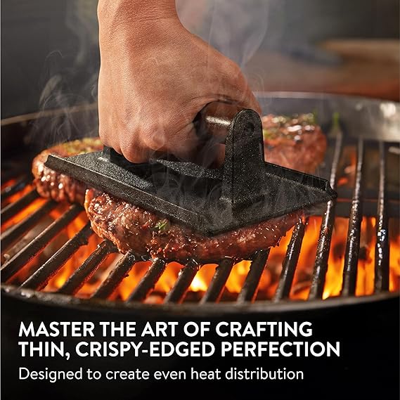 Ideal para barbacoas, cocinas exteriores, sartenes y planchas de hierro. Funciona también a la perfección para bacon, quesadillas, bocadillos calientes y cualquier receta que necesite contacto firme con el calor. Una herramienta hecha para los amantes de la cocina directa y honesta, de esas que dejan huella tanto en el sabor como en el recuerdo.