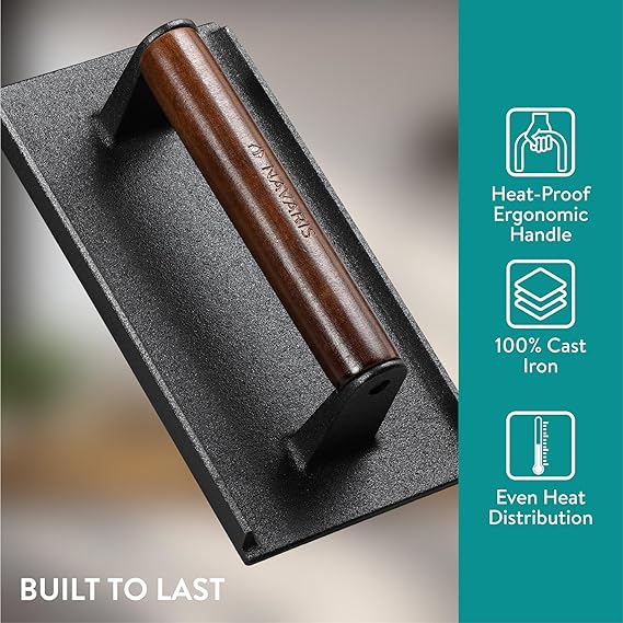 Navaris Prensa de Hierro Fundido para Hamburguesas – Aplastador Rectangular con Relieve y Mango Antideslizante