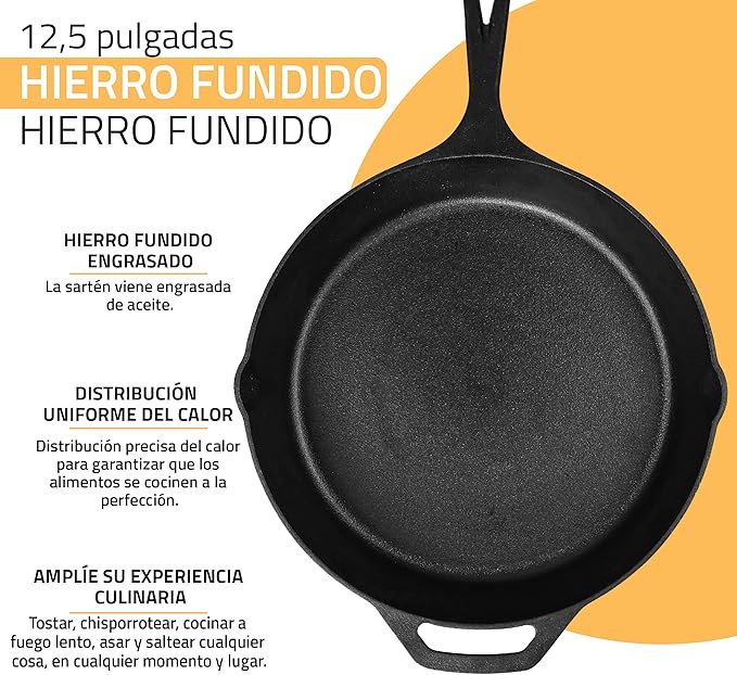 - Material: hierro fundido pre-sazonado con aceite natural.